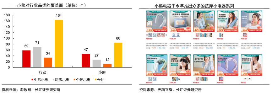 經典案例:根據淘數據、天貓官旗、長江證券研究所等綜合資訊表明,小熊電器目前覆蓋的廚房、生活、個護的小電品類數量分別為 27、47、12 個,合計達到 86 個,可見品類擴張仍有空間。2021年以來,小熊在進一步發力進軍母嬰市場的基礎上,擴張了其他子行業的產品線,譬如其加大了對按摩小電器產品的覆蓋,產品價格上依舊遵循此前的性價比、親民定位。