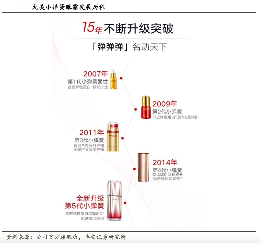 經典案例:根據公司官方旗艦店、華安證券研究所等綜合資訊表明,早在2002年創立之初,丸美就開始專注“眼部肌膚護理”領域。2007 年,隨著丸美彈力蛋白眼精華的面世,一股“彈彈彈, 彈走魚尾紋”的風潮瞬間席卷全國,彈力蛋白系列也成為丸美最受歡迎的王牌產品。多年來公司對其不斷進行升級換代,現已更新至第 5 代。同時其推出了蝴蝶眼膜、小紅筆眼霜、小紫彈眼霜等爆款新品,不斷鞏固其在眼霜領域的領跑地位。