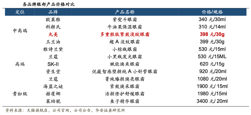經典案例:根據天貓旗艦店、公司官網、公司公告、華安證券研究所等綜合資訊表明,對標國際高端品牌眼部產品,“丸美”具有一定價格優勢:對標國內,同類型競爭對手少,丸美是少有的國產中高端定位并具一定規模的品牌。與國際品牌對比,公司產品屬于中高端,在眼霜中具有性價比。