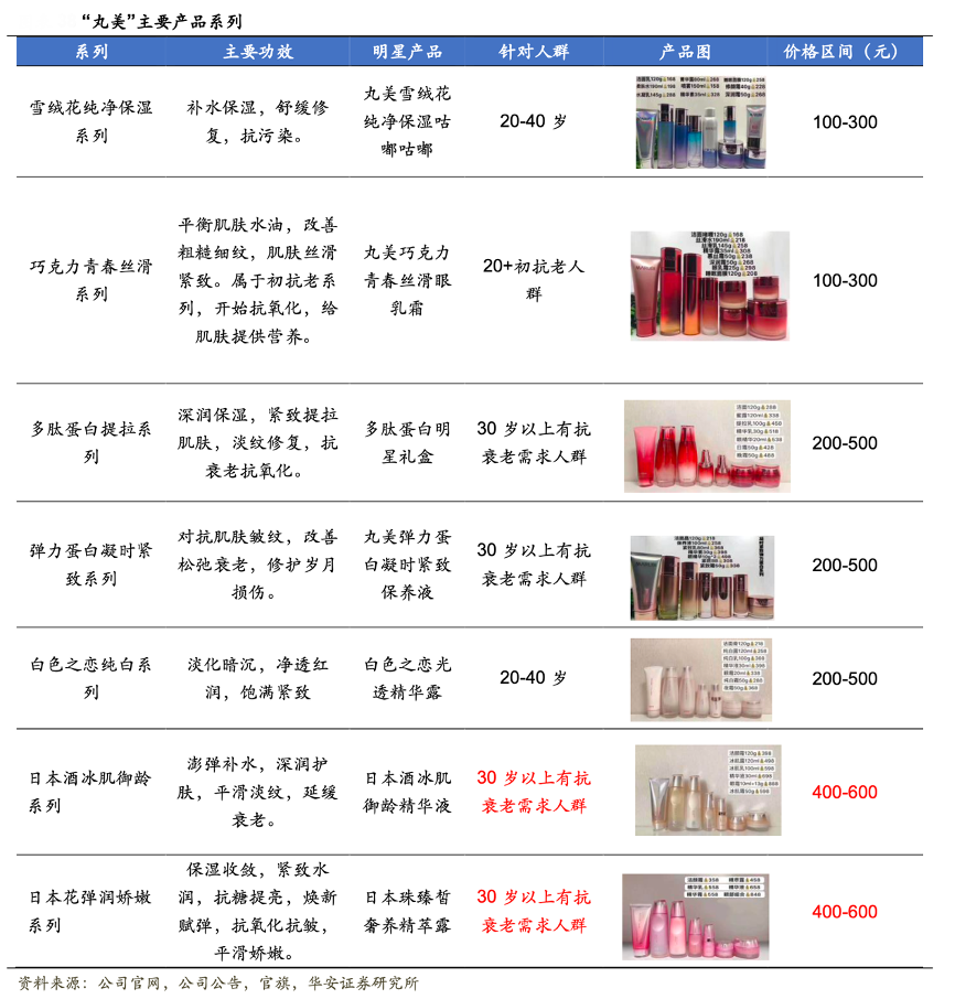 經(jīng)典案例:根據(jù)公司官網(wǎng)、公司公告、官旗、華安證券研究所等綜合資訊表明,“丸美”自一成立開始就堅(jiān)持打造高端化品牌形象,是國內(nèi)稀缺的中高端眼部護(hù)理品牌。其旗下“多肽蛋白提拉系列”、“彈力蛋白凝時(shí)緊致系列”與“白色之戀純白系列”定價(jià)相對(duì)較高,主要價(jià)格處于200-500元,定位中高端,受眾主要為30歲以上有抗老需求人群。2018年新推出的“日本酒御齡冰肌系列”和2019年面世的“日本花彈潤嬌嫩系列”同屬丸美東京高端系列,定位及價(jià)格可比蘭蔻、雅詩蘭黛、資生堂等高端品牌。