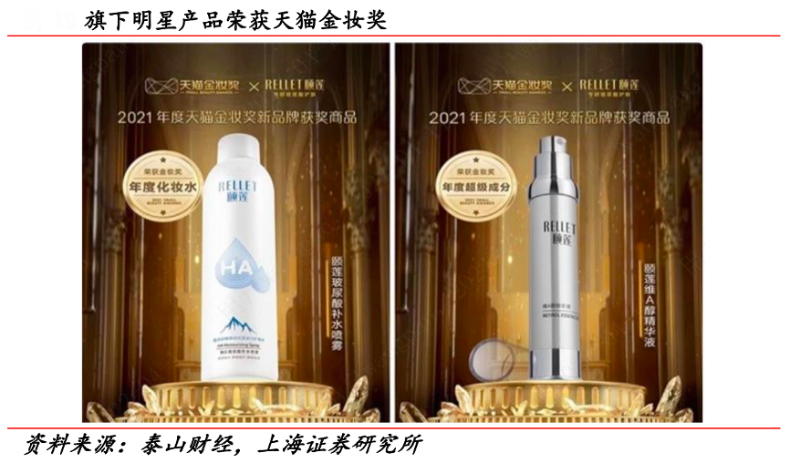 經典案例:根據泰山財經、上海證券研究所等綜合資訊表明,頤蓮在玻尿酸技術迭代方面乘上“成分黨”東風,包裝簡約,依靠“藥學科學院+全球玻尿酸生產基地”專業背書,獲得消費者的信賴與認可。其推出并持續迭代 6 代玻尿酸產品,成功打造頤蓮玻尿酸補水噴霧明星產品,累積銷量突破 1500 萬瓶,引領業績增長。頤蓮玻尿酸補水噴霧入圍天貓金妝獎年度化妝水, 維 A 醇精華液入圍金妝獎年度超級成分商品。