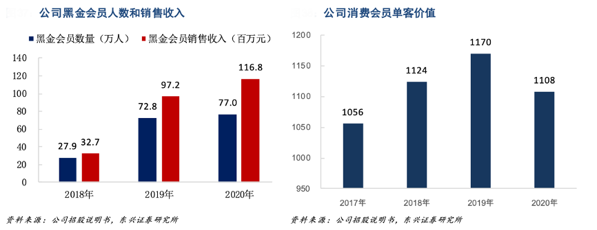 經(jīng)典案例:根據(jù)公司招股說明書、東興證券研究所等綜合資訊表明,為進一步提高單客產(chǎn)值,黑子王公司對會員進行了更加精細化的運營。其公司 2018 年 5 月推出付費黑金 PLUS 會員,分別針對孕婦和嬰幼童兩大目標用戶推出了孕享卡(399 元/年) 和成長卡(199 元/年),有效期均為 1 年,截至 2020 年末公司累計黑金會員 規(guī)模超過 70 萬人,會員數(shù)量和銷售收入逐年增加,2018 年-2020 年黑金會員單個會員平均收入分別為 117.36 元/133.53 元/151.71 元,2020 年付費會員單客年產(chǎn)值為普通會員的 10 倍。