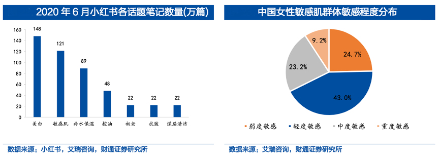 經典案例:根據小紅書、艾瑞咨詢、財通證券研究所等綜合資訊表明,長期佩戴口罩會造成皮膚封閉,容易導致敏感、閉口、長痘。超過七成的敏感肌問題可以通過日常的保養護膚得到改善。消費者對敏感肌專業護理的認知和關注度不斷提升,根據艾瑞咨詢報告,截至 2020 年 6 月小紅書平臺“敏感肌”話題筆記高達 121 萬篇,遠高于“補水保 濕”、“控油”等傳統護膚熱點話題筆記數量。