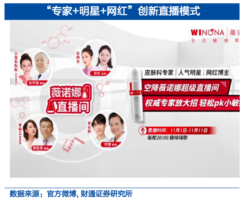 經典案例:根據官方微博、財通證券研究所等綜合資訊表明,薇諾娜公司從 2013 年起,薇諾娜邀請皮膚科專家在官微及其他平臺進行免費直播義診,累計達數百場;2020 年更成為首個受邀參加天貓超級品牌日的護膚國貨品牌,通過“專家科普+明星推薦+網紅博主”的創新直播模式進行產品深度種草,活動期間取得了很好的品牌宣傳和市場聲量。2021 年,深度合作超頭 KOL 李佳琦進行營銷創新,參與《所有女生的 offer》 綜藝節目,更成功打造出爆品單品凍干面膜。