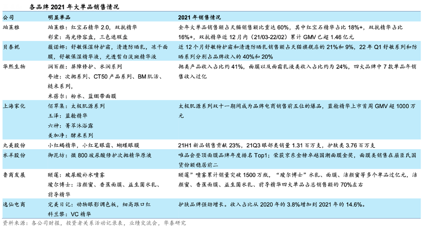 經(jīng)典案例:根據(jù)各公司財報、投資者關(guān)系活動記錄表、業(yè)績交流會、華泰研究等綜合資訊表明,2021 年,珀萊雅、貝泰妮(薇諾娜)、華熙生物(潤百顏/夸迪等)等國貨龍頭繼續(xù)發(fā)力產(chǎn)品,明星單品的亮眼表現(xiàn)成為其收入增長根本引擎。