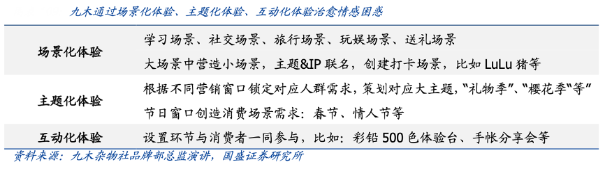 經(jīng)典案例:根據(jù)九木雜物社品牌部總監(jiān)演講、國(guó)盛證券研究所等綜合資訊表明,年輕群體主要有三大主要情感困惑:孤獨(dú)、被需要和安全感,相比商品價(jià)格、質(zhì)量,更看重品牌的情感連接。九木以“體驗(yàn)、場(chǎng)景、治愈”為核心建設(shè)線(xiàn)下門(mén)店,通過(guò)場(chǎng)景化體驗(yàn)、主題化體驗(yàn)、互動(dòng)化體驗(yàn)構(gòu)建與消費(fèi)者之間的情感連接,傳遞“可逛、可淘的文創(chuàng)雜貨店”品牌認(rèn)知。