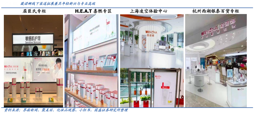 經典案例:根據界面新聞、聚美麗、化妝品觀察、小紅書、國盛證券研究所等綜合資訊表明,2020年6月,薇諾娜打破原有傳統渠道,逐步開通屈臣氏、H.E.A.T 等新零售渠道,截止2021年底已累計入駐 4000 余家屈臣氏店鋪并收效良好,單店產出逐步提升,此外,在 H.E.A.T 喜燃等美妝集 合店中設立專區拓展線下渠道模式。其2021年12月于杭州西湖銀泰設立全國首個百貨專柜,首次線下發布“緊致修護系列”產品并在專柜內設立肌膚檢測服務區,樹立國貨品牌線下銷售新標桿。