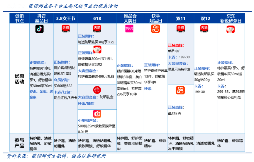 經典案例:根據薇諾娜官方微博、國盛證券研究所等綜合資訊表明,薇諾娜積極參與平臺促銷,促銷節點采取多樣化組合的方式,小促采用小樣拉新/大套盒/卡券紅 包/抽獎秒殺等多種形式有力拉新,大促則以大單品直接打折為主,強力驅動銷量增長。產品展示方面,其突出品牌專業性,詳情頁多方面展示肌膚問題形成原因及產品專利等內容,提升消費者信任度。