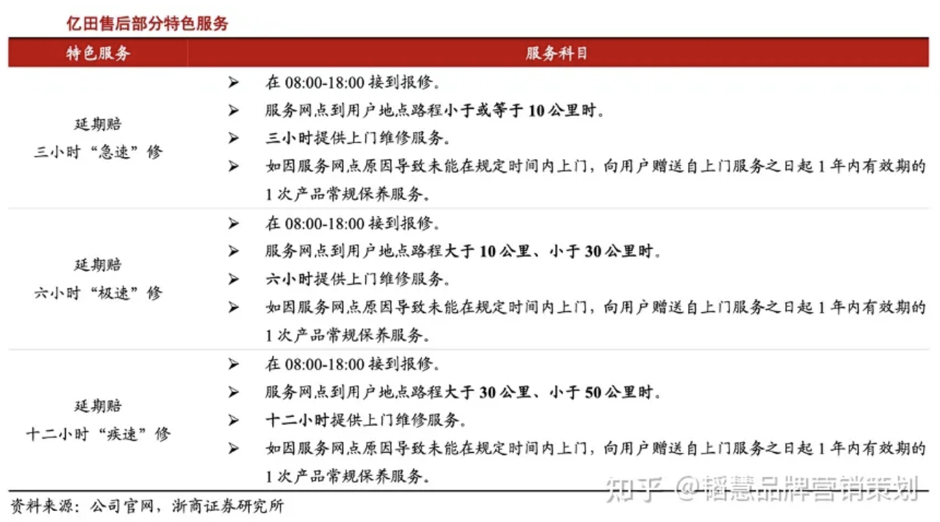 經典案例:根據公司官網、浙商證券研究所等綜合資訊表明,億田服務小哥設立 365 天全年無休快速應答的服務時效機制,截至 21H1,其服務網絡已覆蓋全國所有銷售區域。億田服務小哥落實 10 公里內三小時“急速”修、10 至 30 公里內 六小時“極速”修及 30 至 50 公里內十二小時“疾速”修。