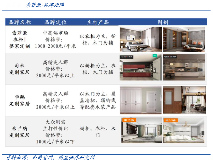 經典案例:根據公司官網、國盛證券研究所等綜合資訊表明,索菲亞成立于2003年廣州增城,中國衣柜行業(yè)的先行者,2011 年 A 股上市,成為國內定制家居第一股,2013年開啟大家居戰(zhàn)略,2021年將索菲亞主品牌“柜類定制專 家”升級為“衣柜|整家定制”。目前,索菲亞戰(zhàn)略定位“整家定制”,多品類、多品牌、全渠道融合發(fā)展。2015-2021 年收入從 31.96 億元提升至 104.07 億元,CAGR 為 21.7%。