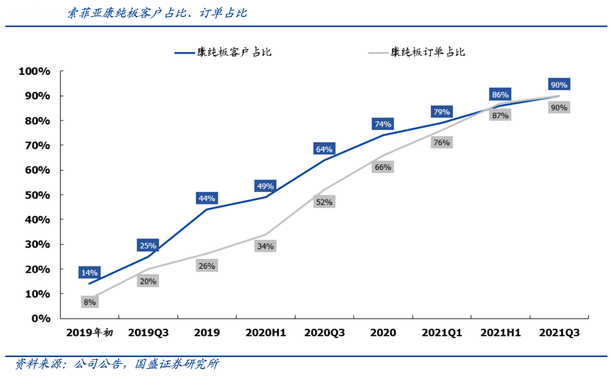 經典案例:根據公司公告、國盛證券研究所等綜合資訊表明,索菲亞公司板材由 E0 板升級至零甲醛添加的康純板,2021年9月索菲亞康純地板正式納入國家孕嬰網體系,成為定制家居唯一入選企業(yè)。2019年至2021Q3,索菲亞康純板客戶占比從 14% 上升至約 90%,訂單占比從 8%上升至約 90%。