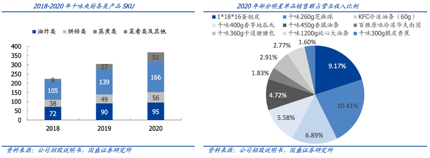經典案例:根據公司招股說明書、國盛證券研究所等綜合資訊表明,千味央廚公司產品種類豐富,截至 2020 年產品 SKU 已達 368 種,其中油炸類、烘焙類、蒸煮類、菜肴類的 SKU 分別為 95/56/166/51 種。油條作為公司在早期切入餐飲供應鏈的核心產品,主打性價比,已在油條子領域占據絕對領先的市場份額,市占率接近60%。