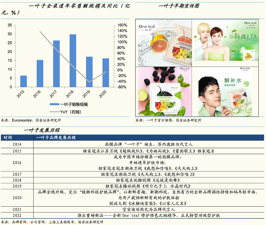 根據歐睿可獲得的數據,一葉子于 2015-2017 年實現高增長,零售額復合 增速達到 102%,2016 年成為中國市場份額第一的面膜品牌。2018 年增速放 緩至 13%、零售規模接近 30 億元。