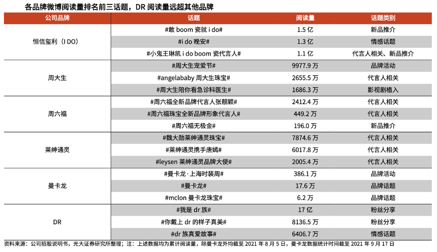 經(jīng)典案例:根據(jù)公司招股說明書、光大證券研究所等綜合資訊表明,截至 2021 年 8 月 5 日,在各珠寶品牌微博話題中,DR的“#我是 DR 族#”話題閱讀量共計達(dá)到 17 億,遠(yuǎn)超其他品牌話題熱度。微博話題上DR粉絲創(chuàng)作發(fā)表的內(nèi)容主要為情感表達(dá),傳播品牌理念,龐大的粉絲基數(shù)與自發(fā)傳播為公司的理念推廣提供了基礎(chǔ)。