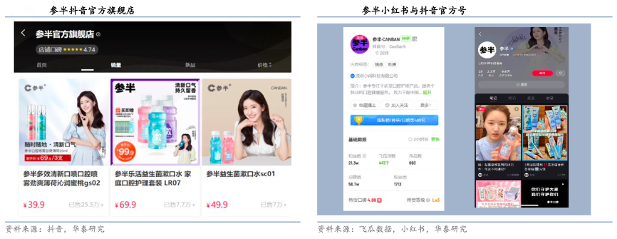 經(jīng)典案例:根據(jù)抖音、飛瓜數(shù)據(jù)、小紅書、華泰研究等綜合資訊表明,參半通過以下方式進(jìn)行營銷:1)明星代言。推出益生菌漱口水前期,參半同時簽下趙露思、毛不易、沈夢辰三位明星對新品進(jìn)行宣發(fā)。2)覆蓋新社交媒體。參半聯(lián)合 B 站、小紅書、抖音等平臺粉絲過萬的腰部、中部網(wǎng)紅達(dá)人, 進(jìn)行產(chǎn)品種草,做新潮內(nèi)容投放。據(jù)抖音站內(nèi) 3 月 28 日搜索數(shù)據(jù),近 30 天 參半品牌關(guān)聯(lián)直播 3108 場,關(guān)聯(lián)視頻 5346 個,抖音銷售額 2482 萬元。