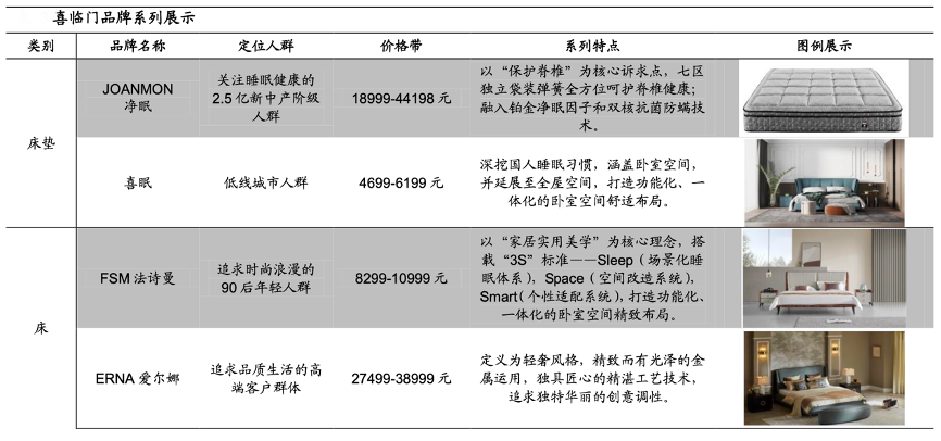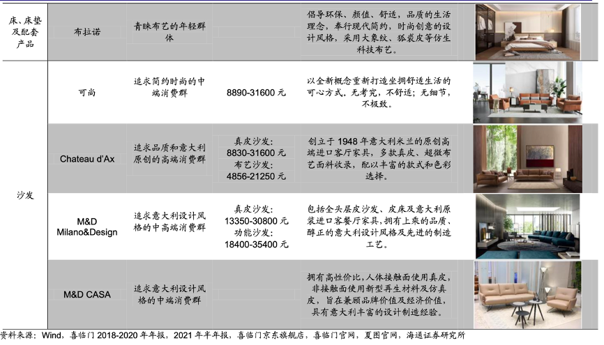 經(jīng)典案例:根據(jù)wind、喜臨門2018-2020年年報(bào)、2021年半年報(bào)、喜臨門京東旗艦店、喜臨門官網(wǎng)、夏圖官網(wǎng)、海通證券研究所等綜合資訊表明,喜臨門以寢具為核心擴(kuò)張品類,臥室與客廳協(xié)同發(fā)展。2021 年,喜臨門的床墊業(yè)務(wù) 實(shí)現(xiàn)營收 39.61 億元,占比 51.76%,較 2009 年下降 23.18pct。