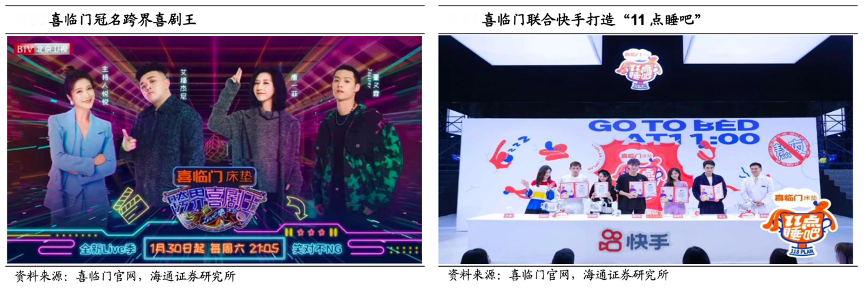 經(jīng)典案例:根據(jù)喜臨門官網(wǎng)、海通證券研究所等綜合資訊表明,喜臨門獨(dú)家冠名了東方衛(wèi)視的 2021 年播出的《中國新相親 4》和北 京衛(wèi)視 2021 年播出的《跨界喜劇王》。除此之外,其2022年聯(lián)合快手打造國內(nèi)首檔明星睡覺比賽《11點(diǎn)睡吧》,向大眾普及“睡吧 118”健康睡眠理念,超 1.1 億人在線觀看。