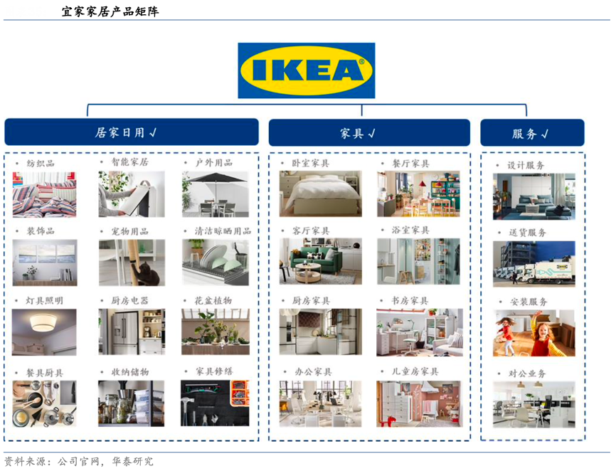 經典案例:根據公司官網、華泰研究等綜合資訊表明,宜家可為消費者提供的產品品類包括床及床墊、沙發坐具、儲物收納、餐具廚房、浴室用品、櫥柜家電、嬰童用品乃至紡織品、清潔晾曬、寵物用品等 20 多個大類,應用區域覆蓋客廳、臥室、廚房、餐廳、兒童房、浴室、書房乃至戶外陽臺等全家居場景,產品總 SKU 數量接近萬個。相較傳統家居品牌專注于特定品類的經營模式,宜家豐富的產品矩陣,配合大店店態及場景化布局,可滿足消費者一站式家居用品采購需求,建立起了強大的產品優勢。