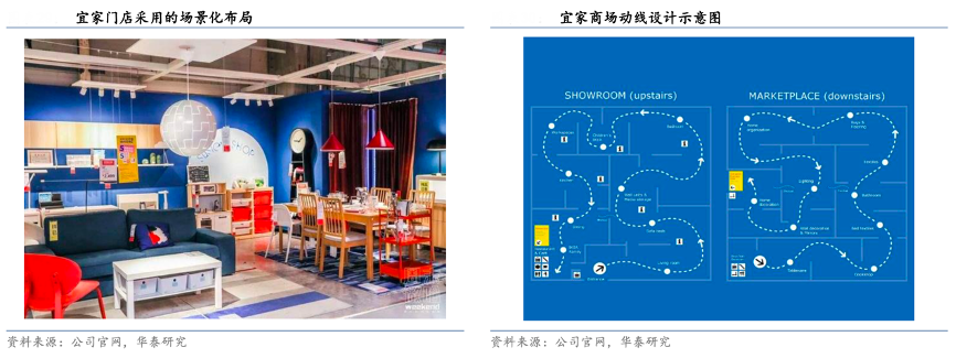 經(jīng)典案例:根據(jù)公司官網(wǎng)、華泰研究等綜合資訊表明,在產(chǎn)品展示方面,宜家堅(jiān)持場景化布局,將賣場分割成代表不同功能區(qū)的展示單元(例如廚房、臥室、客廳等),并按照生活場景布置家居用品的擺放,例如臥室家具區(qū)床架、床墊、床品、床頭柜及衣柜等一應(yīng)俱全,營造出真實(shí)的居家氛圍,激活消費(fèi)者的購買欲望。同時(shí),宜家設(shè)置了單向強(qiáng)制性動(dòng)線,指引消費(fèi)者按照最佳順序逛完整個(gè)商場。