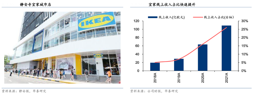 經(jīng)典案例:根據(jù)靜安報(bào)、公司財(cái)報(bào)、官方購物小程序、華泰研究等綜合資訊表明,據(jù)官網(wǎng)消息,2020年7月份宜家在上海靜安寺商圈開出中國第一家宜家“城市小店”,總面積約 3000 平方米,門店共展示約 3500 個(gè)商品,其中約 1200 個(gè)商品可以購買后直接帶走,其余類似沙發(fā)、床具等大件商品可通過線上下單。小店顆粒度更小、總投入更低,作為大店的有效補(bǔ)充,為消費(fèi)者接觸宜 家提供了更強(qiáng)的便利性。宜家公司亦順應(yīng)電商化趨勢,積極打造線上購物渠道,其所有產(chǎn)品均可通過公司官網(wǎng)或宜家 APP 進(jìn)行下單購買,據(jù)公司 2021 財(cái)年財(cái)報(bào),2021財(cái)年宜家官網(wǎng)訪問量超過 50 億。