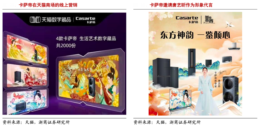 經典案例:根據天貓、浙商證券研究所等綜合資訊表明,2022年三月天貓超級品牌日,卡薩帝搭檔流量明星,聯合“國家寶藏”IP,傳遞卡薩帝高端“鑒賞家”系列產品的核心概念與獨特賣點,獲得曝光量近 2 億、互動量近 3000 萬。與此同時,卡薩帝首次嘗試打破文化藝術與數字科技的界限,特別聯合天貓數字藏品,在 3 月 17 日天貓超級品牌日當天,限量發布概念生活藝術數字藏品。