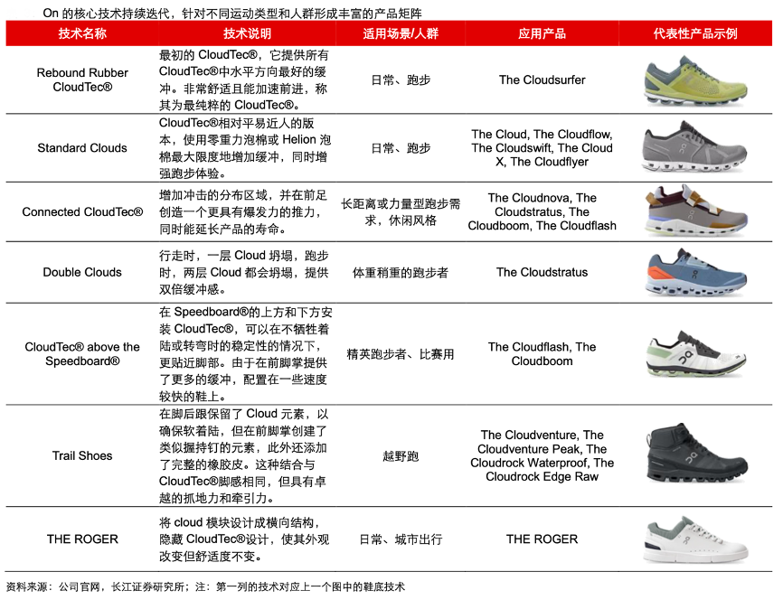 經典案例:根據公司官網、長江證券研究所等綜合資訊表明,On旗下所有鞋款均搭載 CloudTec 結構緩震專利科技,分布在鞋底的 Cloud 模塊在足部觸地時通過水平和垂直雙重作用力帶來輕盈觸地的突破性緩震體驗,同時牢牢鎖住著陸時產生的壓力,并迅速將其轉化為蹬腳推進時的疾速爆發。在 CloudTec 基礎上衍生出了 Double Clouds 等技術,應用于多個鞋款。