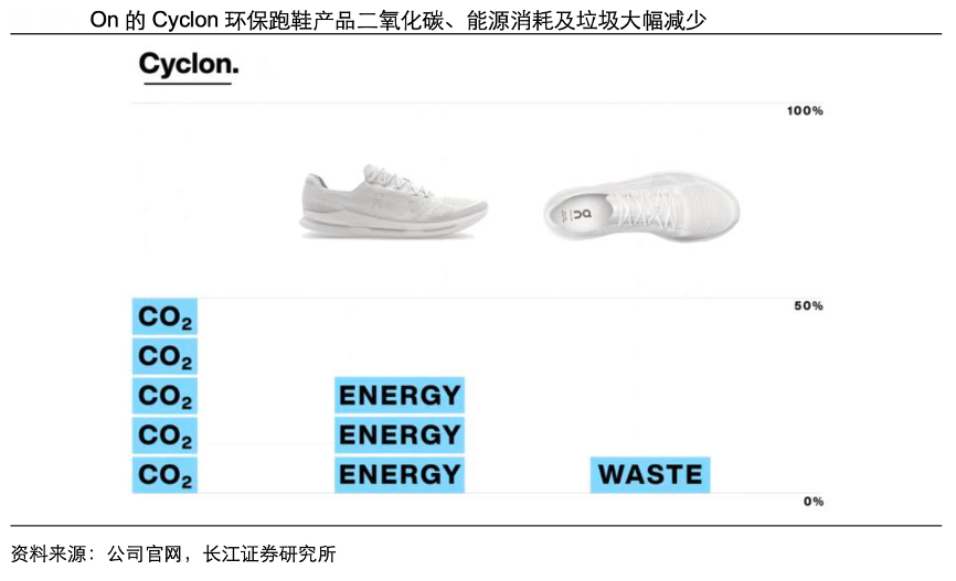 經典案例:根據公司官網、長江證券研究所等綜合資訊表明,On 在其成立一個月后就獲得了 ISPO(唯一 面向全球運動行業產品的權威評選)新品牌獎。同時,On的Cyclon環保跑鞋產品二氧化碳、能源消耗及垃圾大幅減少。