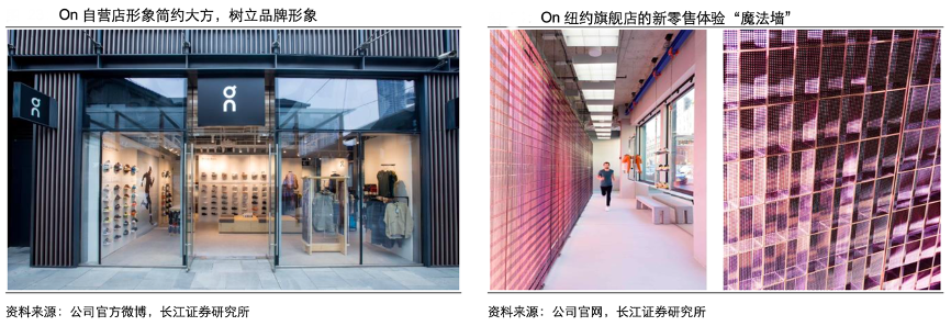 經典案例:根據公司官方微博、公司官網、長江證券研究所等綜合資訊表明,On旗艦店和自營店主要起梳理品牌形象和培育消費者品牌認知的作用,adw 選址位于核心商圈且店鋪形象簡約,并以新零售體驗向消費者傳遞品牌的科技概念,如紐約旗艦店的“魔法墻”實時掃描購物者的跑步風格,以幫助他們找到適合其跑步風格和需求的鞋款。