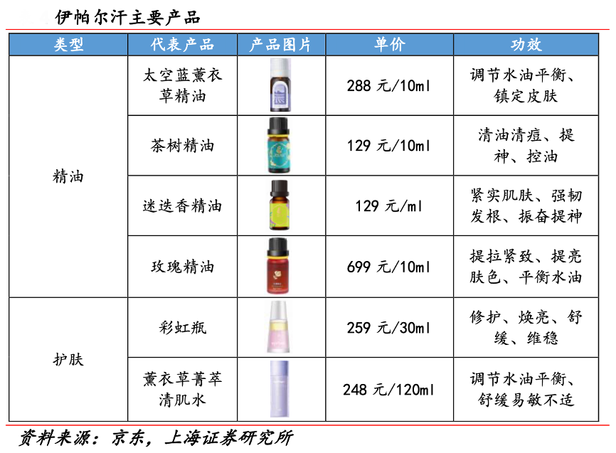 經典案例:根據京東、上海證券研究所等綜合資訊表明,伊帕爾汗是國內首家以天然香料為核心,集產地種植、研發、生產、銷售、旅游觀光于一體,全國唯一獲準使用“伊犁薰衣草精油”地理標志保護的企業。主要產品包括4 大類 12 個系列 120 余種天然香料系列產品,涉及芳香理療、芳香護膚、芳香保健、芳香養生等多個領域。其擁有從種植薰衣草到提取精油到開發系列產 品的完整生產線。2021年上半年,公司完成銷售收入近 2000 萬 元,同比增長 37%。