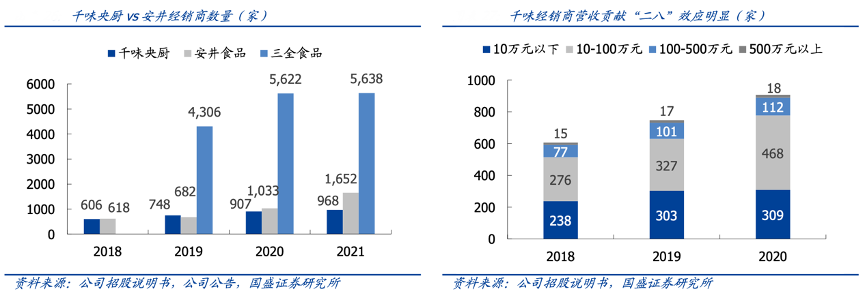 經典案例:根據公司招股說明書、公司公告、國盛證券研究所等綜合資訊表明,2021年底,千味央廚公司經銷商數量增長至 968 家,較 2020 年的 907 家同比+6.73%。此外,從 2020 年起公司開始加大經銷渠道建設力度,賦能核心經銷商,例如對百萬元以上經銷商配備單獨銷售服務,梳理話術舉辦品鑒會等,目前已初現成效,占比前20 名經銷商銷售額達 2.06 億,同比+50.1%。
