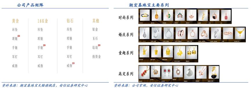 經典案例:根據潮宏基珠寶天貓旗艦店、公司官網、安信證券研究中心等綜合資訊表明,潮宏基品牌已經形成了時尚、婚慶、童趣和高定四大系列來滿足不同客群的需求。每個系列下包含吊墜、項鏈、手鏈、戒指、耳飾、手鐲、串珠這七大品類;材質上除了主推的 K 金外,涵蓋黃金、鉆石、鉑金、珍珠以及彩寶等。以各大珠寶品牌的天 貓旗艦店為例,2022 年 3 月潮宏基珠寶 SKU 達 2667 個,僅次于周大福位居行業第二。