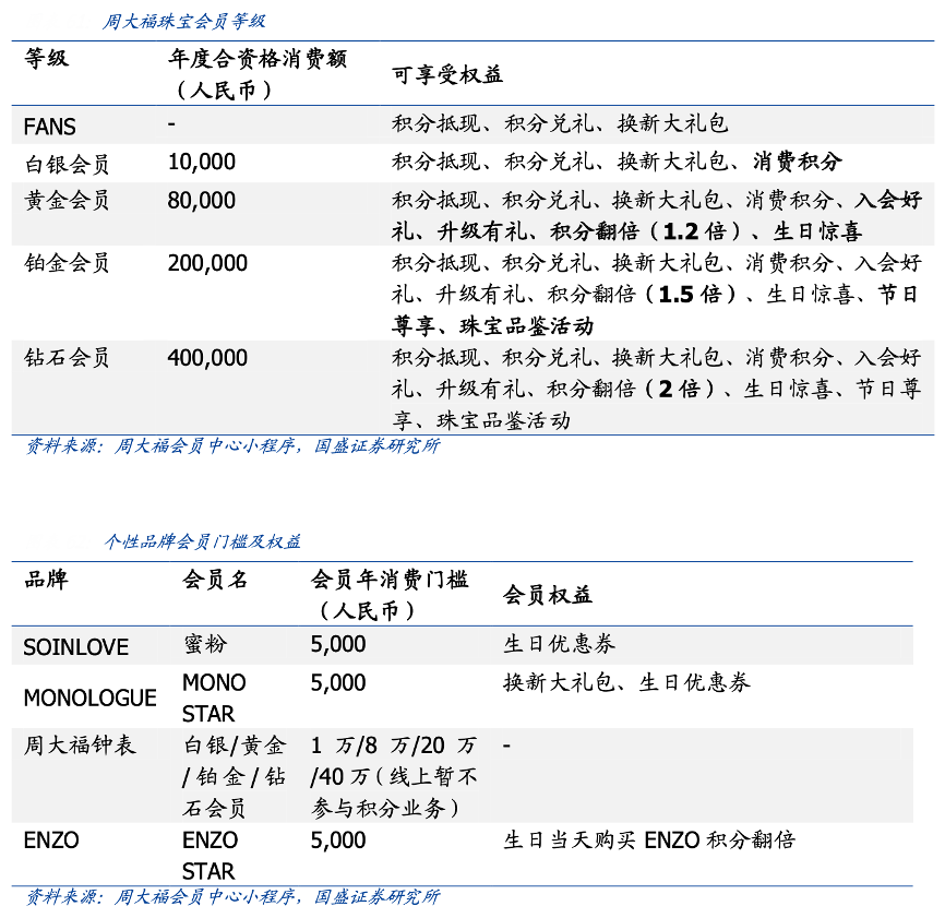 經典案例:根據周大福會員中心小程序、國盛證券研究所等綜合資訊表明,周大福公司為會員準備了專屬福利,會員可受邀參加 Good Living Plus(GLP+)會員計劃,以享受額外的獎賞優惠,包括在與公司合作的商戶取得休閑、酒店與旅游優惠。此外,客戶按照消費金額可享受不同級別的會員計劃,隨著會員級別的升高,會員將享有更多權利,包括積分抵現、積分翻倍、生日驚喜、節日尊享等,“鉑金會員”及“鉆石 會員”還有機會參與公司組織的線下高端沙龍和高端珠寶拍賣會活動。與此同時,顧客通過在個性化品牌店消費還可以獲得個性品牌專屬會員。