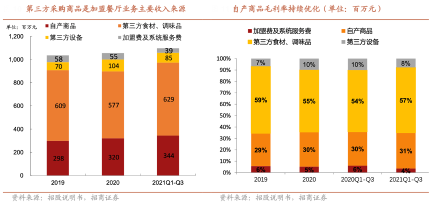 經典案例:根據招股說明書、招商證券等綜合資訊表明,楊國福公司加盟餐廳業務收入主要分為加盟及系統服務費、自產商品銷售收入、第三方商品銷售收入三類。其公司營收主要來自于供應鏈相關環節業務,自產商品與第三方采購商品銷售是公司主要收入來源,自產商品收入占比持續提升。2019年-2020年與 2021Q1-Q3 公司實現第三方采購食材、調味品收入 6.0 億元/ 5.8 億元/6.3 億元,占加盟餐廳業務收入比分別為 58.8%/54.6%/54.2%,是加盟餐廳業務的主要收入來源。