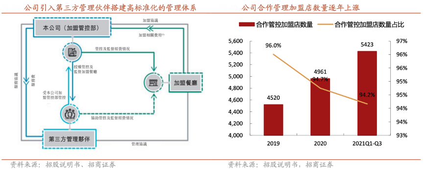 經典案例:根據招股說明書、招商證券等綜合資訊表明,為確保楊國福公司能通過加盟模式實現全國范圍內的高速拓 店,早于 2010 年其公司便引入了第三方管理伙伴機制以提高對加盟商的監管,目前公司除上海、四川、海南、西藏、 新疆以外的加盟餐廳為直接管轄外,國內其他區域均為合作管理區域。截至 2021 年 Q3,公司擁有第三方管理伙伴 18 人,所有合作管理伙伴均為加盟商,合作管理門店數量達到 5423 家,占加盟餐廳數量的94.2%。