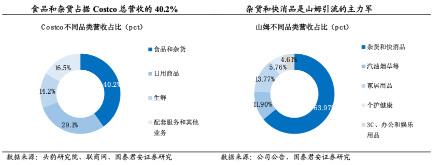經典案例:根據頭豹研究院、聯商網、公司公告、國泰君安證券研究等綜合資訊表明,雜貨和快消品是山姆引流的主力軍,食品和雜貨占據Costco總營收的40.2%,強引流產品帶來大量客流。