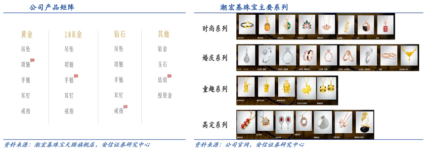 經典案例:根據潮宏基珠寶天貓旗艦店、公司官網、安信證券研究中心等綜合資訊表明,潮宏基消費群體偏年輕,且悅己需求占比較大,其品牌已經形成了時尚、婚慶、童趣和高定四大系列來滿足不同客群的需求。每個系列下包含吊墜、項鏈、手鏈、戒指、耳飾、手鐲、串珠這七大品類;材質上除了主推的 K 金外,涵蓋黃金、鉆石、鉑金、珍珠以及彩寶等。以各大珠寶品牌的天貓旗艦店為例,2022 年 3 月潮宏基珠寶 SKU 達 2667 個,僅次于周大福位居行業第二。