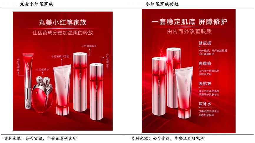 經(jīng)典案例:根據(jù)公司官方旗艦店、華安證券研究所等綜合資訊表明,在深度把握眼部護(hù)膚市場的同時,丸美公司將產(chǎn)品線延伸至面部護(hù)膚,提高公司增長的天花板。以小紅筆家族為例,其在小紅筆眼霜的基礎(chǔ)上由眼及面,推出了小紅蝎精華、小紅筆精華潔面、小紅筆精華乳、小紅筆精華水一套產(chǎn)品,實(shí)現(xiàn)全面抗衰。