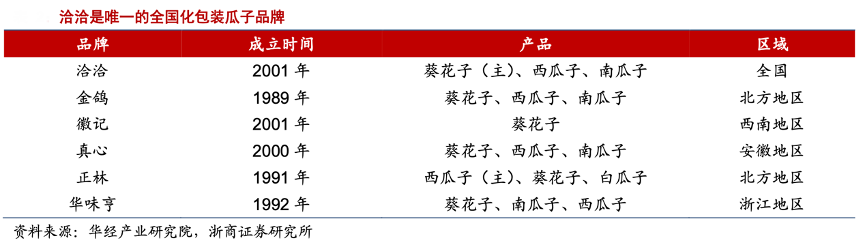 經典案例:根據華經產業研究院、浙商證券研究所等綜合資訊表明,相較于堅果炒貨整體市場的快速擴張,瓜子市場發展趨于成熟。從供需角度來看,2009 年后我國食用葵花籽消費量相對穩定,2014-2020 年都穩定在 100 萬噸左右;競爭格局則呈現“1+N”模式,全國化品牌僅有洽洽一家,其他多為區域性品牌,根據中國食品工業協會的數據,2019 年洽洽食品在包裝流通瓜子中占比 54%。