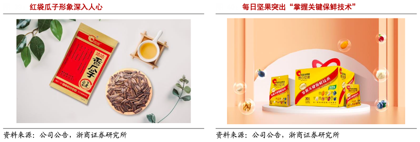 經典案例:根據公司公告、浙商證券研究所等綜合資訊表明,洽洽發展早期通過央視投放廣告的方式將“不上火、不臟手“的產品特點傳達給全國消費者,紅色牛皮紙包裝沿用至今使得消費者一看到包裝就能想到洽洽,建立起消費者對公司產品的具象化認知;堅果業務公司差異化定位新鮮,在產品包裝和營銷上都突出“掌握關鍵保鮮技術”的口號,滿足消費者對健康和營養的需求。