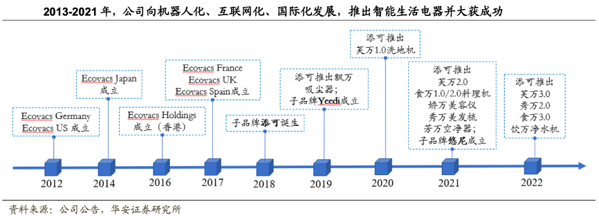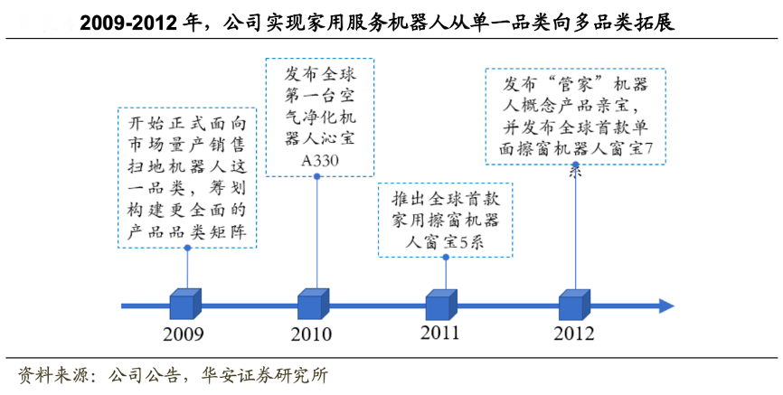 經(jīng)典案例:根據(jù)公司公告、華安證券研究所等綜合資訊表明,2012年,科沃斯公司發(fā)布“管家”機(jī)器人概念產(chǎn)品親寶,并發(fā)布全球首款單面擦窗機(jī)器人窗寶 7 系。至此,公司已初步構(gòu)建起由掃地“地寶”、擦窗“窗寶”、空氣凈化“沁寶”和管家“親寶”組成的家用機(jī)器人完整產(chǎn)品線,完成產(chǎn)品由點(diǎn)到線的第二次轉(zhuǎn)型。