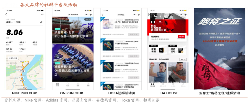 經典案例:根據Nike官網、Adidas官網、亞瑟士官網、安德瑪官網、Hoka官網、招商證券等綜合資訊表明,各大跑鞋品牌積極創建品牌跑步俱樂部,直接觸達核心消費者。如 Nike 創立 NIKE RUN CLUB;阿迪達斯創立ADIDAS RUNNERS;New Balance 創立 NBRC; 美津濃創辦跑步訓練營等等;線上提供運動指導,并根據用戶需求推薦鞋款及跑步建議;線下定期策劃并舉辦各種課程指導及路跑活動,時常邀請運動領域 KOL 一同參與分享專業技巧。