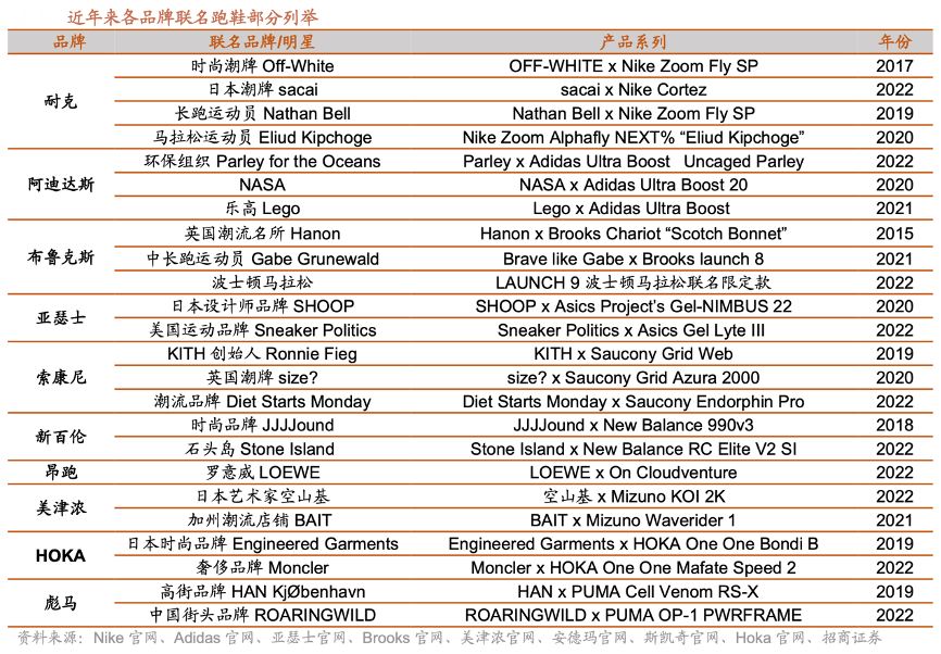 經典案例:根據Nike官網、Adidas官網、亞瑟士官網、Brooks官網、美津濃官網、斯凱奇官網、安德瑪官網、Hoka官網、招商證券等綜合資訊表明,專業運動聯名強化運動基因,Nike 與專業運動員 Nathan Bell 聯名;Adidas 與 NASA 聯名; Brooks 與波士頓馬拉松聯名等。