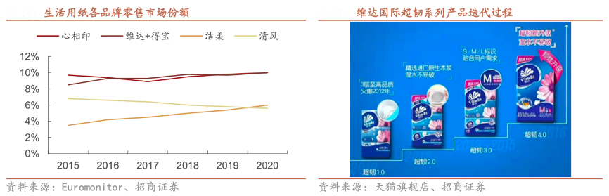 經典案例:根據Euromonitor、天貓旗艦店、招商證券等綜合資訊表明,維達的“木本色紙”產品采用了獨有的 4D 立體美壓花技術,擴充了本色紙產品線,2021年推出 4D 立體美第四 親膚抑菌卷 紙及超迷你濕廁紙等,深受消費者歡迎。其對產品持續迭代,新一代超韌產品進行了原料升級、平滑度升級、吸水升級、緊致度升級與包裝升級五大升級。