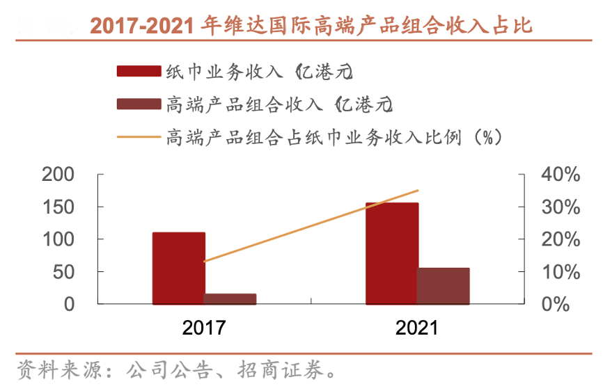 經典案例:根據公司公告、招商證券等綜合資訊表明,維達專注高端生活用紙市場,持續優化產品組合,并將旗下得寶、維達立體美、多康及濕巾定義 為高端產品組合。高端組合貢獻的收入占紙巾業務總收入比例從 2017 年的 13.1%上升至 2020 年的 30.6%,高端產品組合收入 17-20 年 CAGR 達 7.65%,2021年高端組合占比提升至35%。
