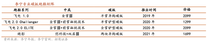 經典案例:根據李寧官網、李寧年報、招商證券等綜合資訊表明,李寧通過?科技實現頂尖技術突破,2019 年李寧推出第一款碳板跑鞋飛電 1.0,?科技搭載半掌異構的碳板,售價 2099 元,正式進入頂級跑鞋行列;并于2020 年推出搭載全掌碳板的飛電 2.0 ELITE;東京奧運會 上公司的精英級競速跑鞋飛電 2.0 出現在馬拉松比賽的項目中,并且是整個東京奧運會馬拉松完賽選手上腳的跑鞋中 唯一的中國品牌跑鞋,標志李寧產品性能達到世界頂尖水平,成功躋身競速跑鞋的第一梯隊。