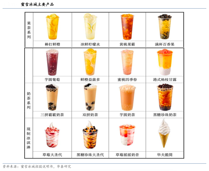 經典案例:根據蜜雪冰城招股說明書、華泰研究等綜合資訊表明,蜜雪冰城公司推出多款暢銷產品,并已儲備超200 個門店產品應用方案。公司門店產品研發以研發團隊為主導,市場運營中心、采購中心、品牌中心為輔。其不斷開發出熱銷的產品,如魔天脆脆冰淇淋、搖搖奶昔、冰鮮檸檬水、珍珠奶茶等熱銷產品。熱銷產品價格多不超過 10 元,滿足大眾“物美價廉”的消費需求。