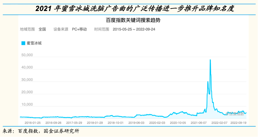 經典案例:根據百度指數、國金證券研究所等綜合資訊表明,2019年蜜雪冰城公司請國內知名品牌公司設計的第三代品牌形象和根據經典民謠改編的廣告曲發布,可愛的 IP 形象+朗朗上口的廣告曲符合平價品牌調性。經歷兩年沉淀,雪王 IP 在 2021 年成為熱點,品牌知名度進一步打開;此后公司又進行了“雪王黑化”等營銷事件,也引起了廣泛關注。