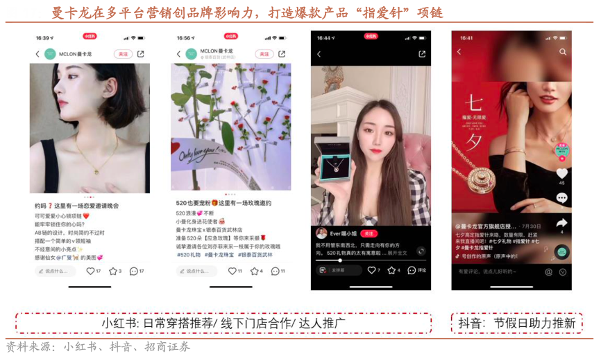 經(jīng)典案例:根據(jù)小紅書、抖音、招商證券等綜合資訊表明,曼卡龍?jiān)谛〖t書、抖音等媒介通過日常穿搭推薦、與線下商場門店以及達(dá)人合作等方式深化品牌定位,精準(zhǔn)客戶畫像。節(jié)假日內(nèi)如七夕等節(jié)日,品牌借助節(jié)日氣氛,推進(jìn)爆品“指愛針”的銷售,為品牌在渠道上的發(fā)展做好鋪墊。“指愛針”的營銷內(nèi)容在抖音達(dá)到 7.9 億播放量,互動(dòng) 3000+萬,520、七夕期間,爆款項(xiàng)鏈在天貓、京東的單品銷量榜均為第一。