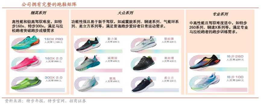 經典案例:根據特步年報、特步官網、招商證券等綜合資訊表明,特步公司利用優質材料和結構開發多元化功能性跑鞋,擁有針對大眾跑者、專業跑者、精英跑者需 求的三條主要產品線,依托中底技術升級不斷迭代現有產品系列,滿足跑者多元化需求。