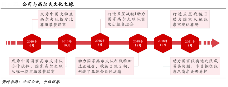 經典案例:根據公司公告、中銀證券等綜合資訊表明,比音勒芬公司定位于中高端休閑服飾市場,其起家于高爾夫服飾,深耕高爾夫文化。早在 2003 年成立之初,比音勒芬就與高爾夫運動綁定,之后陸續圍繞高爾夫運動推出專業高爾夫系列服飾,在專業的運動領域打造專業的運動品牌基因。